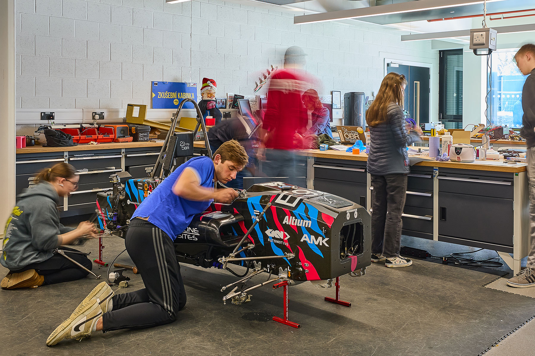 The new Purpose Built Workshop at Oxford Brookes University complements the adjacent Teaching Building, providing industry-standard technical facilities to support engineering and technology education. Located on the site of a former car park, it features specialised areas for test rigs, hot works, high-voltage battery systems, and a flexible central workshop. Designed to support teaching in disciplines like motorsport engineering, robotics, and material sciences, the workshop emphasises both functionality and sustainability.